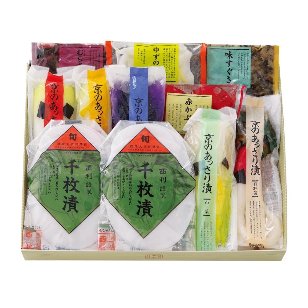 千枚漬70g×2、大根あっさり漬1/4割、白菜あっさり漬223g、茄子あっさり漬1個入、日野菜あっさり漬1本、赤かぶら80g、赤しそむらさきの50g、味すぐき40g ほか2種計11点