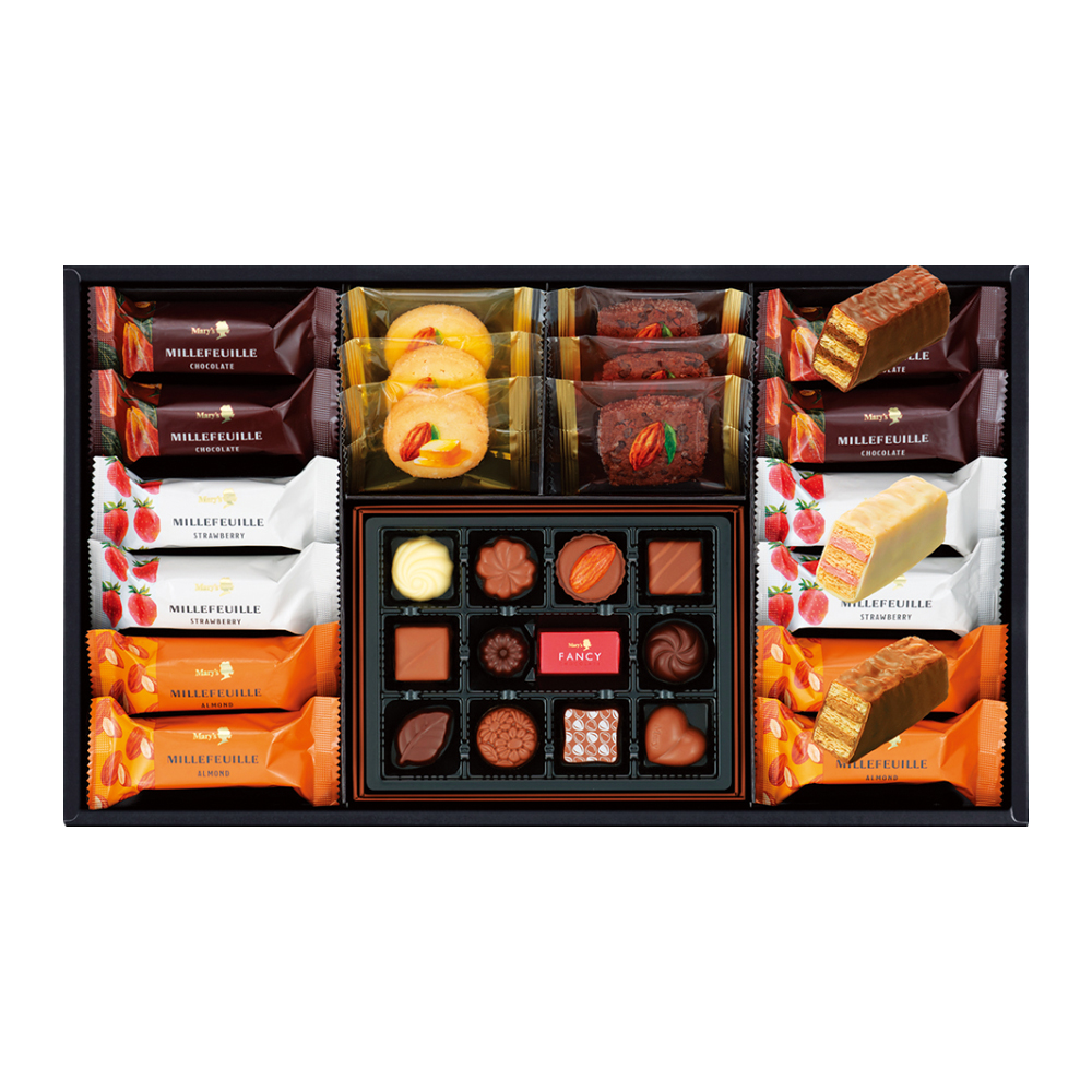 ファンシーチョコレート×12、ミルフィーユ×12(アーモンド・ストロベリー・チョコレート各4)、カカオサブレ2種計6