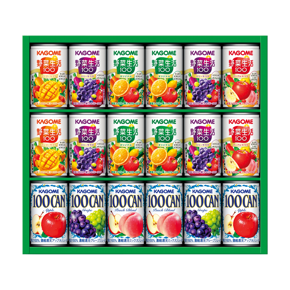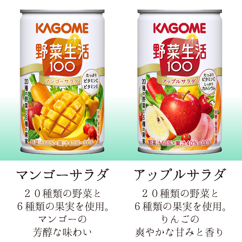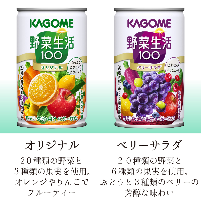ピーチブレンド・アップル・グレープ各160g×2、野菜生活100オリジナル・野菜生活100ベリーサラダ各160g×4、野菜生活100マンゴーサラダ・野菜生活100アップルサラダ各160g×2