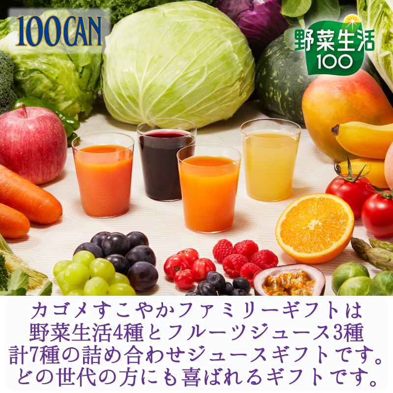 家族みんなが笑顔になる、うれしい贈りもの。カゴメの「すこやかファミリーギフト」は、人気の100%フルーツジュース「100CAN」と、野菜と果実の美味しさがぎゅっと詰まった「野菜生活100」をバランスよく詰め合わせた、健康サポートとおいしさを両立したギフトセットです。彩り豊かなラインナップは、100%ジュースのアップルやグレープなどのフルーツの恵みに加え、野菜生活100シリーズのオリジナル・ベリーサラダ・マンゴーサラダなどの野菜飲料も充実。お子様からご年配の方まで、幅広い世代に喜ばれる内容です。季節のご挨拶や、ちょっとした感謝の気持ちを伝えるのにぴったり。