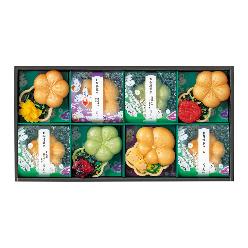 お茶漬:聖護院だいこん漬け・賀茂なすしば漬け・梅各2、お吸物:九条ねぎ(ゆば)×2