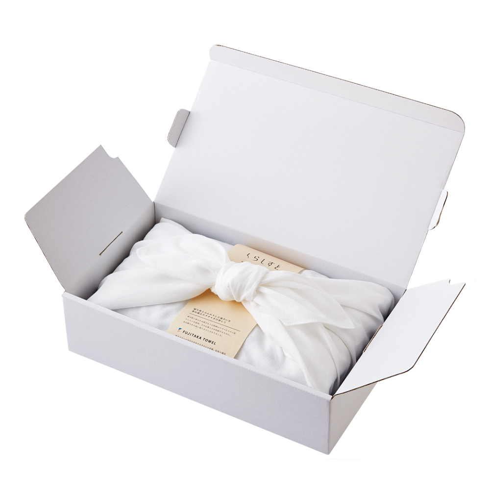 タオルは台紙を使わず直接風呂敷で包み、四角いボックスに入れてお届けします。