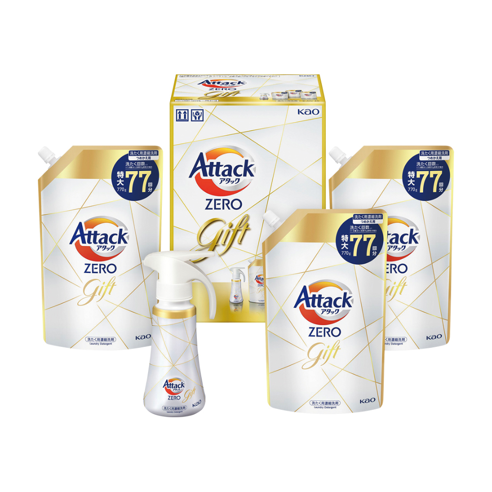 落ちにくい汚れ、生乾き臭、洗剤残りを取り除く‘ゼロ洗浄’のアタック。片手で使えるプッシュボトルのギフト。