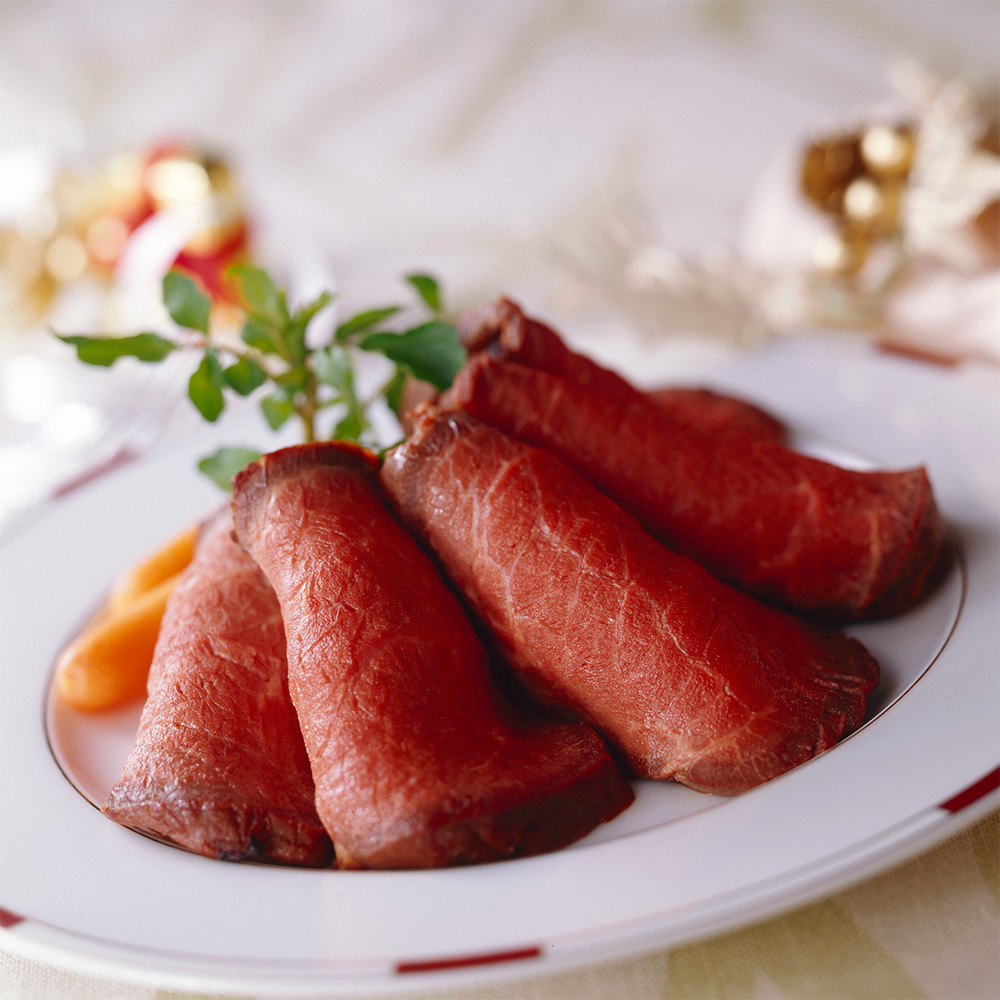 黒毛和牛もも肉の表面を高温で焼いてから、じっくりと加熱し、風味や旨みを逃がさず、柔らかくジューシーな味わいに仕上げました。