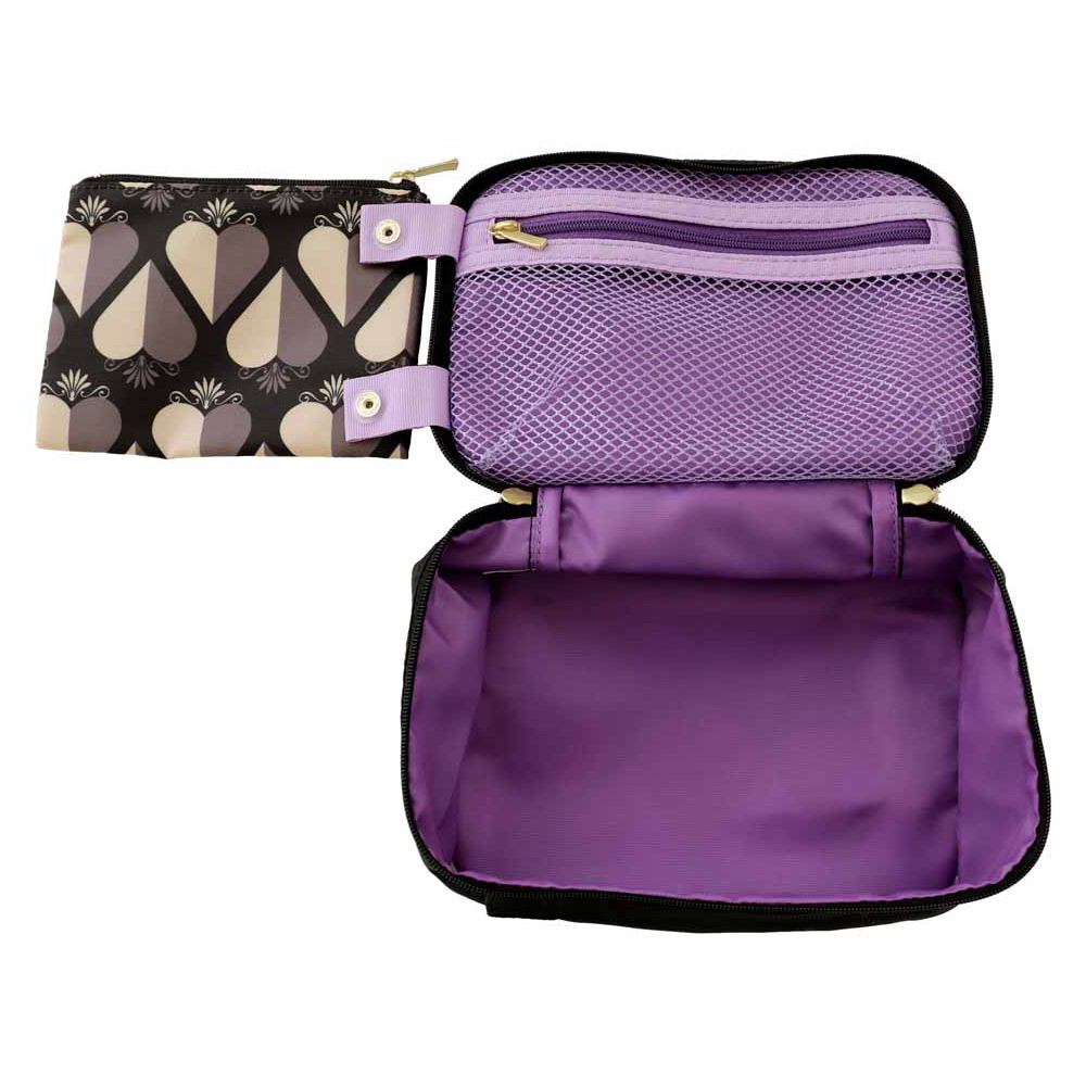 付属のミニポーチやポケットで薬やアクセサリーもスッキリ収納できます。ANNA SUIらしい華やかな裏地のカラーもポイント。