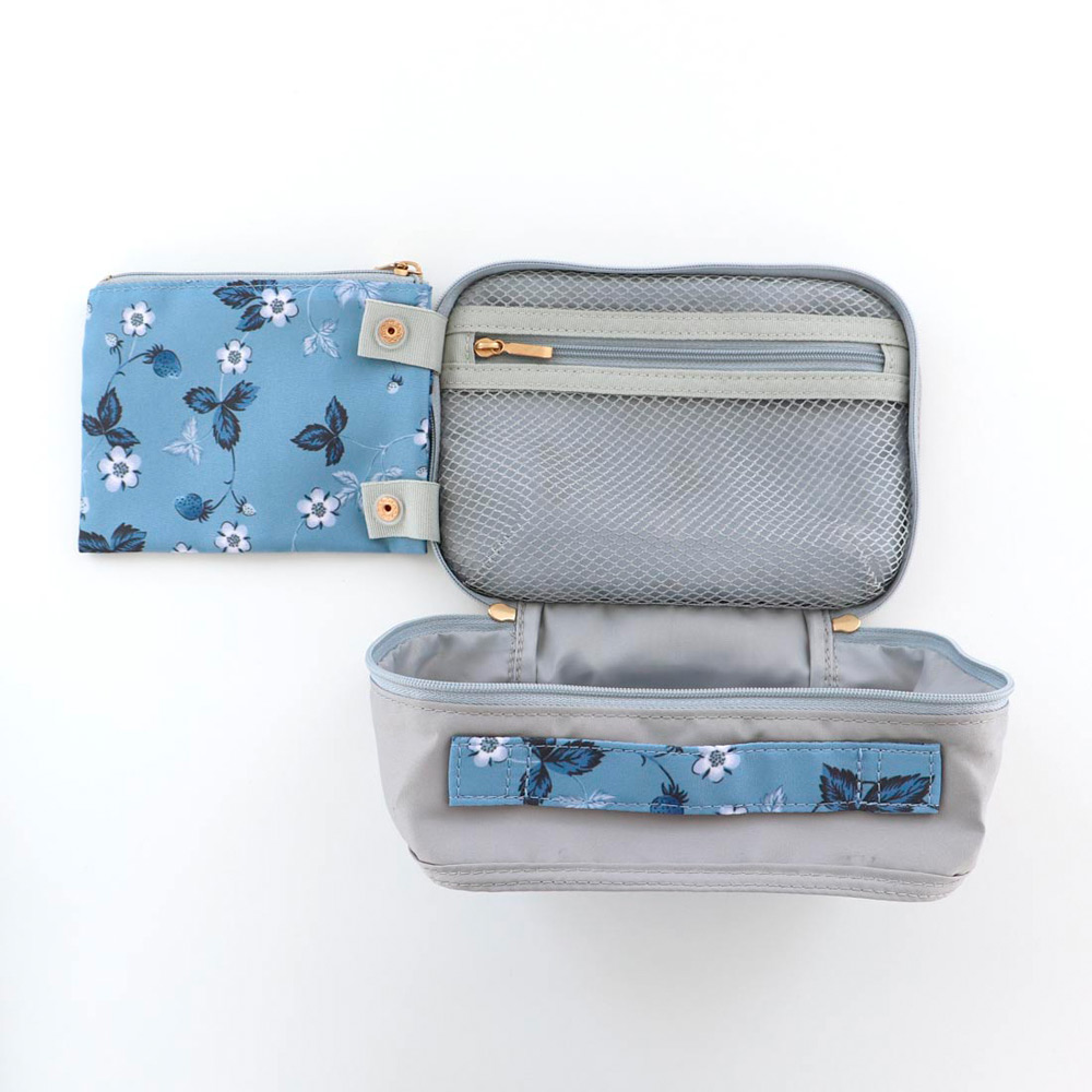 持ち運びに便利な持ち手付き。内側には取り外し可能なミニポーチとポケットが付いているので仕分けにも便利です。