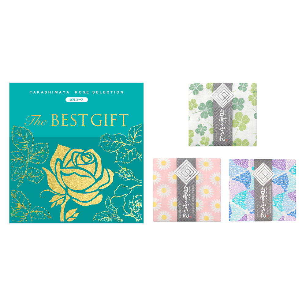 国内外の有名ブランド雑貨、ファッショングッズ、厳選された食材やスイーツなど、多彩なギフトシーンに対応できるカタログギフトに、幸運を呼ぶといわれる「四つ葉のクローバー」や吉祥のシンボル「松竹梅」、「マーガレット」柄の白雪ふきんをセットにしました。「カタログギフトだけでは物足りない…」というお客様にぴったりのセットです。
