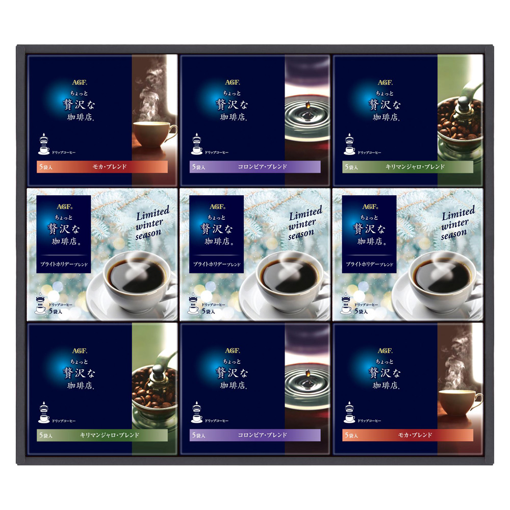 「ちょっと贅沢な珈琲店」ドリップコーヒー:ブライトホリデーブレンド(5P×3)、モカ・ブレンド(5P×2)、キリマンジャロ・ブレンド(5P×2)、コロンビア・ブレンド(5P×2)