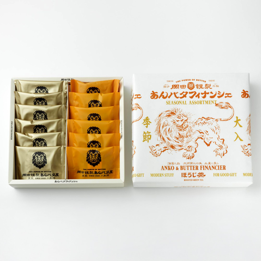 フィナンシェから湧き立つエキゾチックな『バター』の香りと希少な北海道千歳産『えりも小豆』を使用した餡子。すべてを逃さぬよう高温で香ばしく焼き上げました。『ほうじ茶』と丁寧に焦がしたバターを練り込んだフィナンシェ生地で餡子をを包み込んだ『ほうじ茶』味との詰め合わせ。