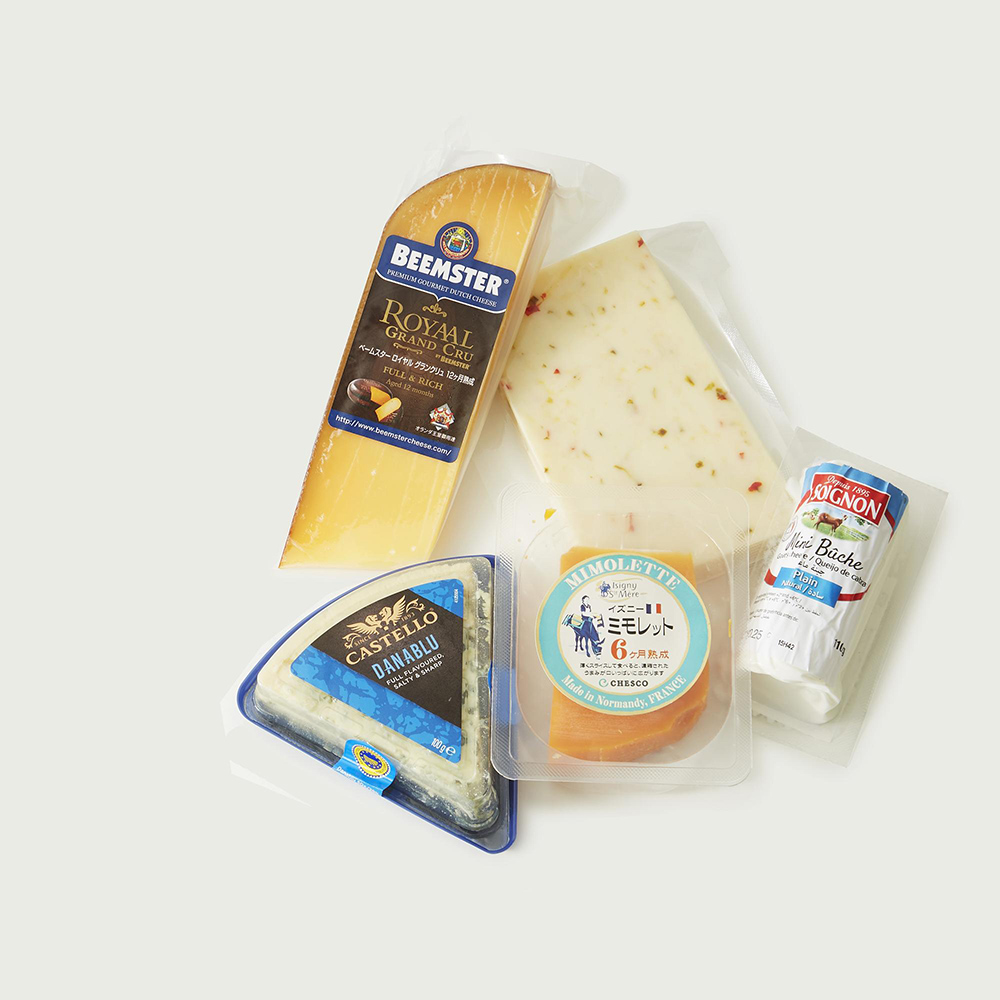 ミモレット6ヶ月熟成 60g、ソワニョン フレッシュシェーブルプレーン 110g、ベームスター ロイヤルグランクリュ12ヶ月熟成 150g、キャステロ ダナブル 91g、ペッパージャック 250g