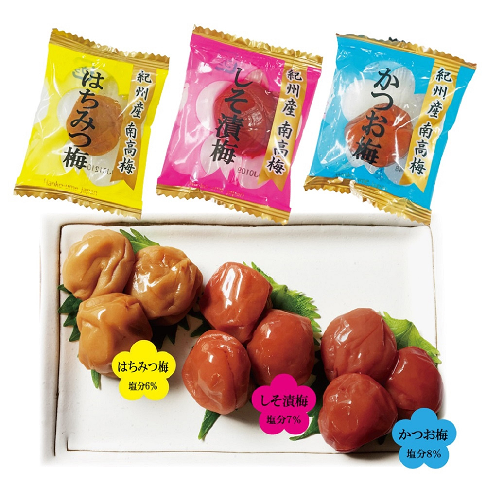 完熟の紀州産南高梅を蜂蜜に漬け込み、塩分約1.5%のフルーティーな甘口に仕上げたはちみつ梅、しそ液に漬け込み塩分約1.5%のさっぱりしそ風味に仕上げたしそ漬け梅、はちみつ梅・しそ漬け梅・かつお梅の3種を個包装に仕上げたアソート梅干の詰合せです。