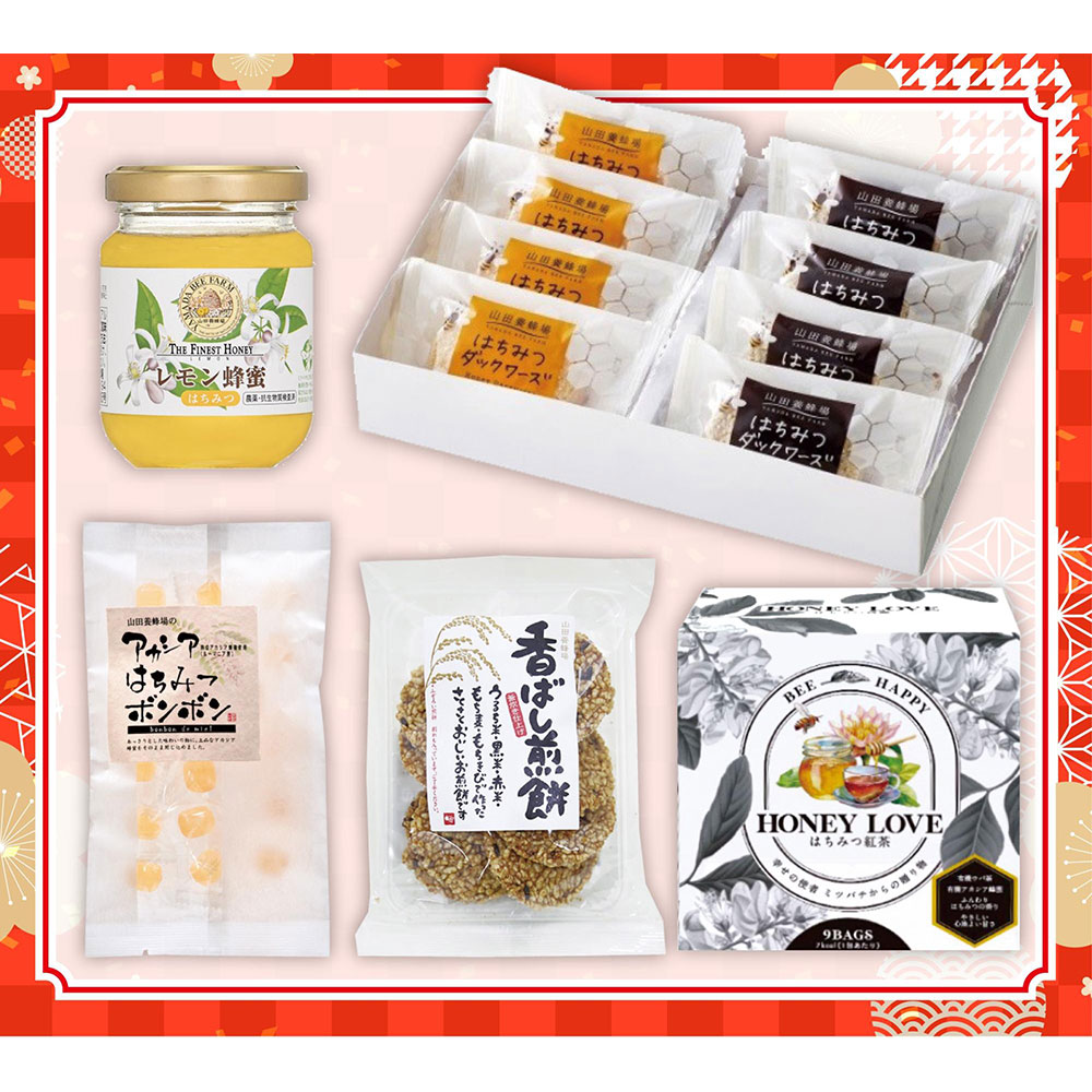 爽やかな酸味とやさしい甘さの「レモン蜂蜜」、はちみつの専門家が最高品質の素材を掛け合わせた「はちみつ紅茶」、アカシア蜂蜜のやさしい甘さが香るクリームをサクッとした食感の米粉生地でサンドした「はちみつダックワーズ」、当社人気No.1の熟成アカシア蜂蜜を包み込み、飴の中からとろりとはちみつがあふれ出す「アカシアはちみつボンボン」、そして、もち麦、黒米、赤米、もちきび、白米の五穀を使用した「香ばし煎餅」。はちみつの豊かな恵みを存分にお楽しみいただける、特別な福袋です。