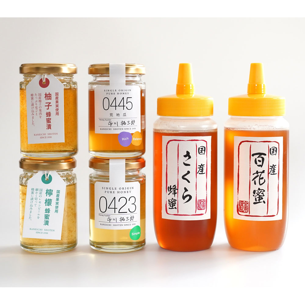 国産百花蜜480g、国産さくら蜂蜜480g、SO 0423 兵庫県加古郡産ヘアリーベッチ蜂蜜140g、SO 0445 福島県郡山市産荒地瓜蜂蜜140g、檸檬漬蜂蜜140g、柚子漬蜂蜜140g 各1本 計6本セット