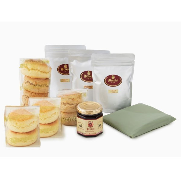 スコーンは、定番のプレーンとダージリンアールグレイの茶葉が練りこまれた紅茶、小粒のレーズンとほんのりシナモンが香るカレンズにこうばしい香りが特徴のメープルくるみです。ジャムは、コクのあるブルーベリーと1番人気ダージリンアールグレイを合わせたベノアオリジナル低糖度のジャムです。紅茶は、豊かなコクのアッサムとベノア1番人気のダージリンベースのアールグレイティー、爽やかな飲み心地のウバティーも入って色々お楽しみいただけます。たっぷり入って折りたためて便利なオリジナルエコバッグも付いています。