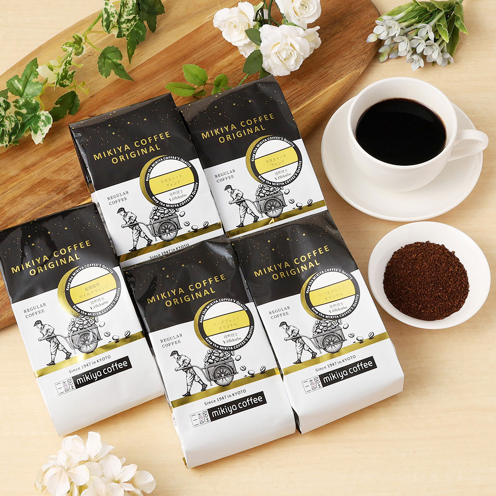 mikiya coffee人気No.1のローズブレンドオリジナルは、コク・香り・酸味のバランスがとれたコーヒー。モカスイートブレンドと石焼焙煎マイルドブレンドの詰合せは合計750g。