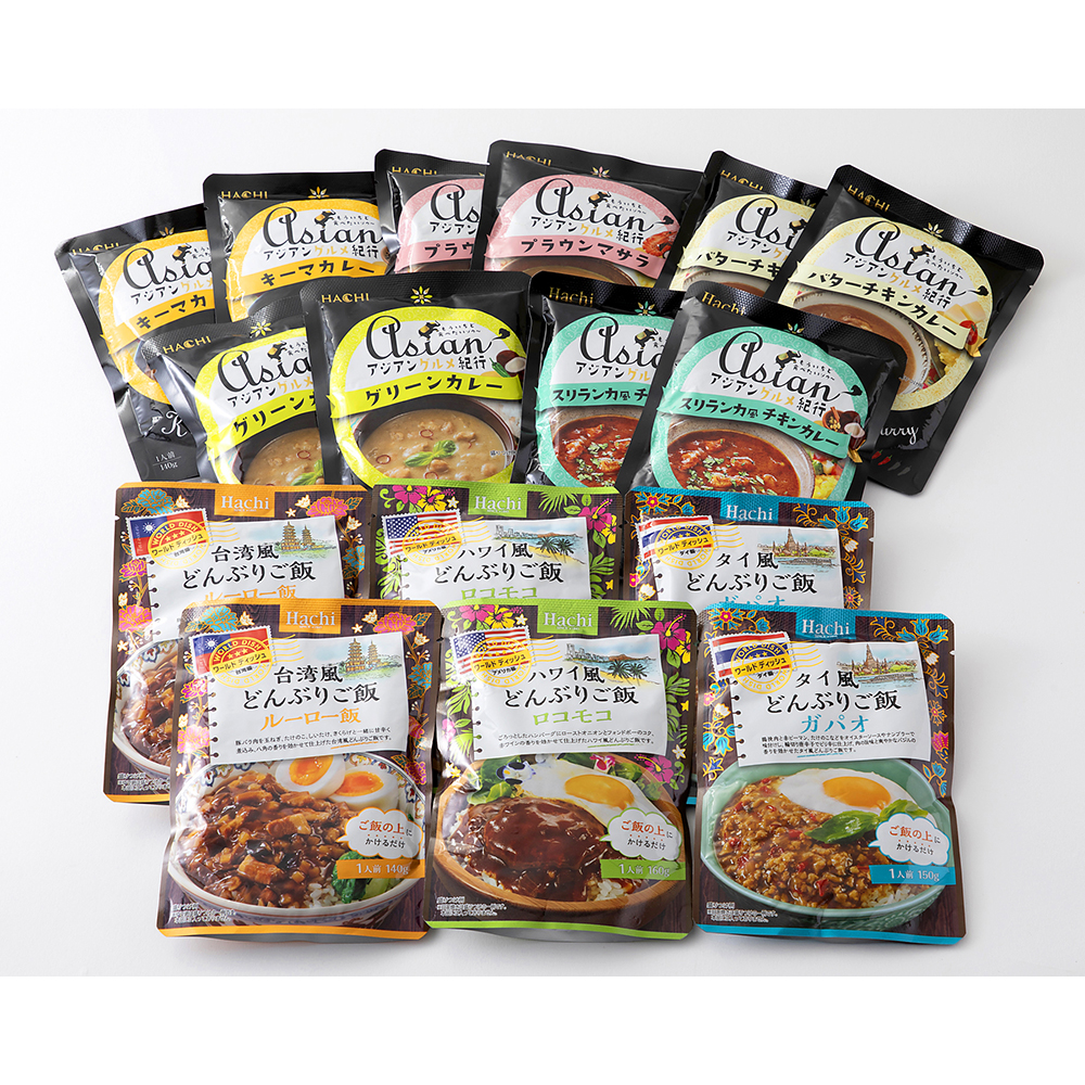 アジアングルメ紀行グリーンカレー150g・アジアングルメ紀行プラウンマサラ150g・アジアングルメ紀行キーマカレー(中辛)140g・アジアングルメ紀行バターチキンカレー(中辛)150g・アジアングルメ紀行スリランカ風チキンカレー150g・ワールドディッシュタイ風どんぶりご飯ガパオ150g・ワールドディッシュ台湾風どんぶりご飯ルーロー飯140g・ワールドディッシュハワイ風どんぶりご飯ロコモコ160g 各2点 計16点