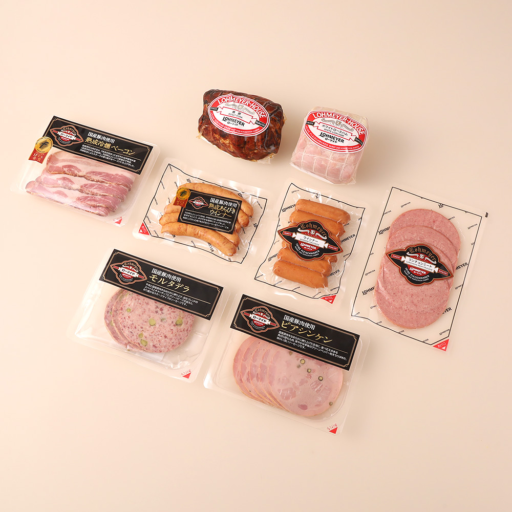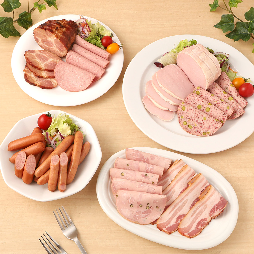 ホワイトロースハム410g、肩ロース焼豚380g、ウインナー 110g、ランチョンミート60g、熟成冷燻ベーコン65g、熟成あらびきウインナー 105g、モルタデラ 80g、ビアシンケン70g