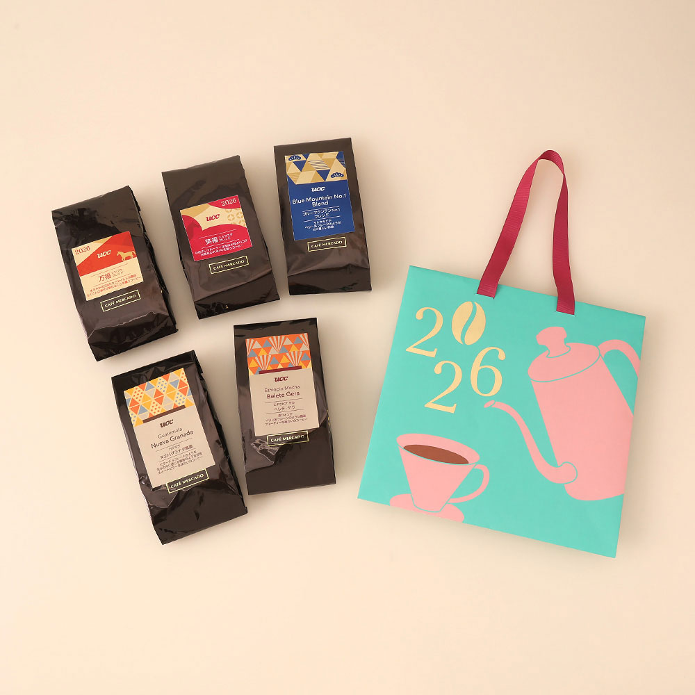 福袋限定のブレンド2種とブルーマウンテンNo1ブレンド、モカベレテゲラ、ガテマラヌエバクラナダ農園をセットにしました。