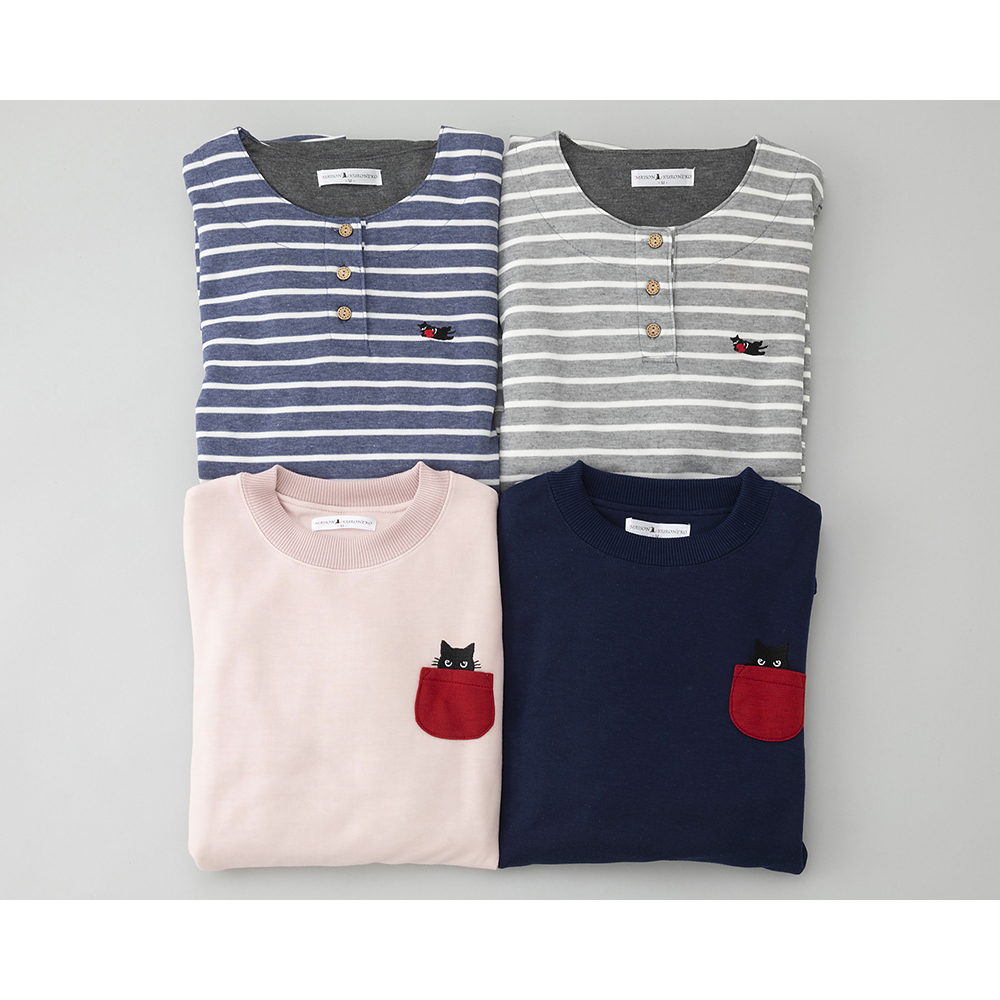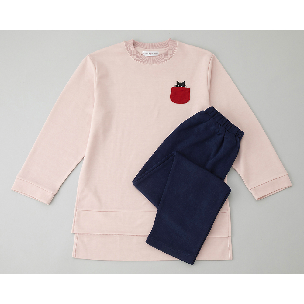 ダンボールニットは、保温性が高いだけでなく、シワになりにくく、ふんわりとした肌触りの柔らかさもあり、これからの時期のルームウェアにぴったりの素材です。可愛らしいねこちゃんのワンポイント刺しゅうがポイントです。おうち時間をゆったりとお過ごしください。