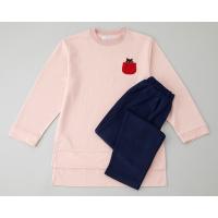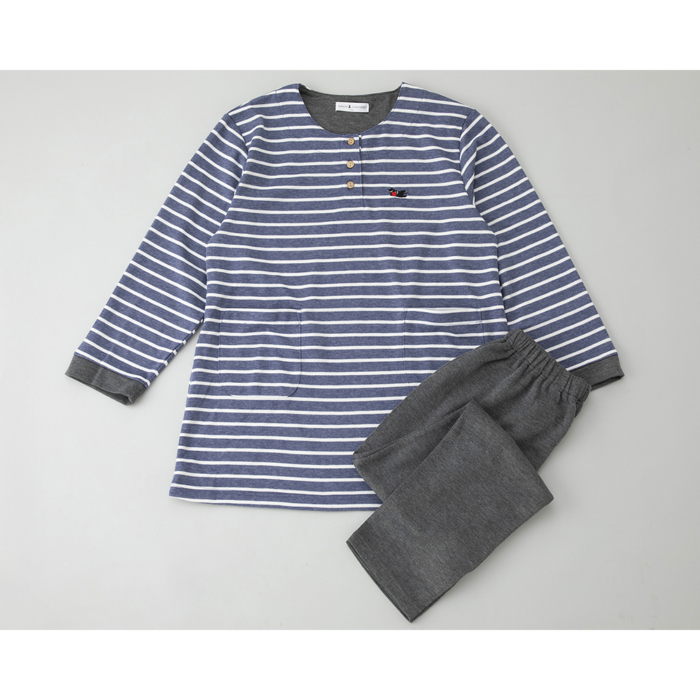 上着丈はお腹がすっぽり隠れるチュニックタイプ。あたたかくシワになりにくい素材なので、家事やおうちでのリラックスタイムにぴったりです。