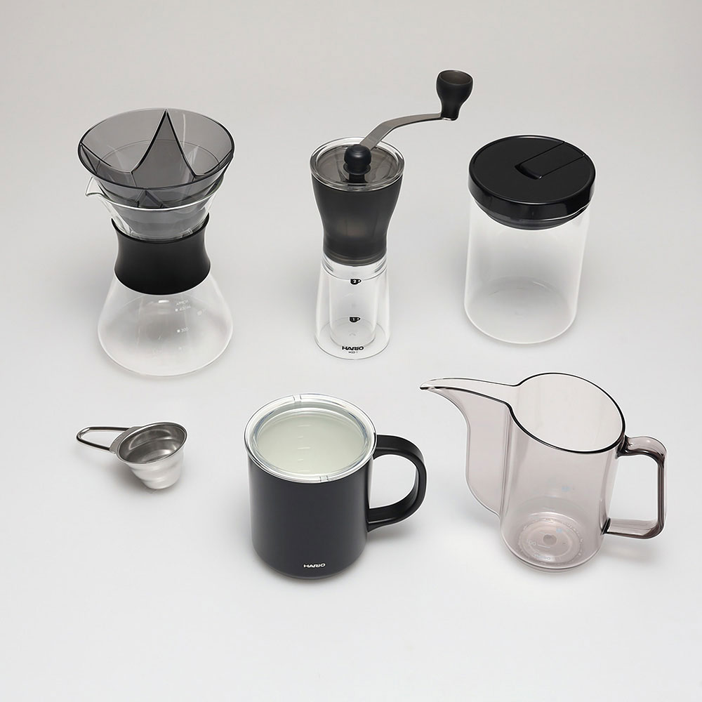 <セット内容>コーヒーポット×1、ドリップケトル×1、真空二重保温マグ×1、コーヒーミル×1、キャニスター×1、軽量スプーン×1 計6点