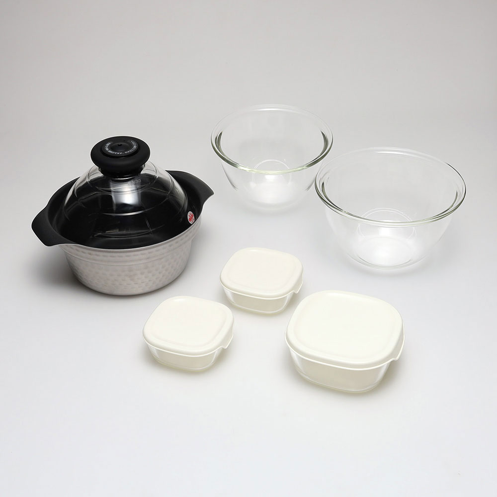 <セット内容>フタがガラスのIH対応ご飯釜雪平×1、耐熱ガラス製保存容器3個(S×2個・M×1個)セット×1、耐熱ガラス製ボウル2個(M、L各1個入り)セット×1 計3点