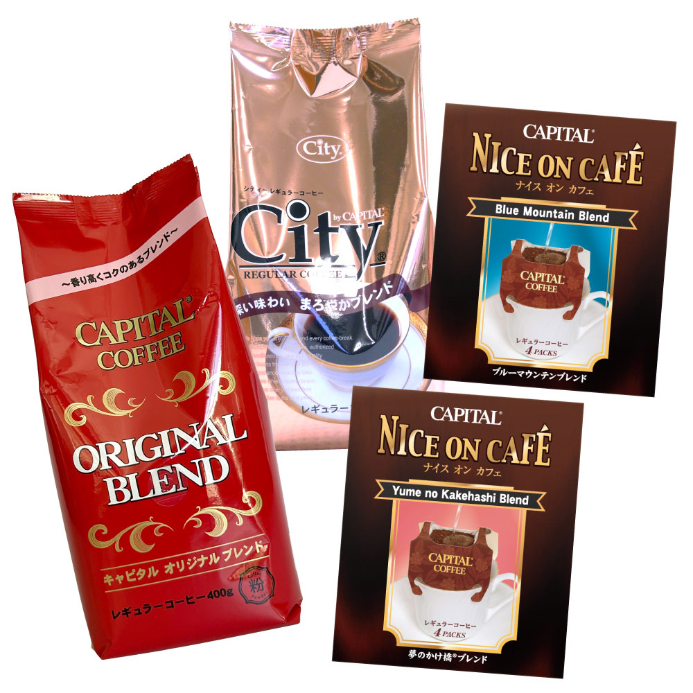 レギュラーコーヒー(粉・中細挽き):ブラジル・コロンビアを主体に中南米産の豆を程よくブレンドした、香り高くコクのあるキャピタルコーヒーの自信作で、長年愛され続けてきた「オリジナルブレンド」と、高品質豆を深めのローストに仕上げ、酸味を抑えマイルドな味わいと豊かなコクを引き出している「CITY まろやかブレンド」がお楽しみいただけます。ドリップコーヒー:キャピタルコーヒーを代表する「夢のかけ橋ブレンド」は、コロンビア・ブラジル等を程良くブレンドし、酸味・苦味・香りが調和され、コクがあってすっきりしているバランスの良いブレンドです。「ブルーマウンテンブレンド」はジャマイカの最高級コーヒー「ブルーマウンテン」を主体に上品な香りと贅沢な味わいを最大限に引き出した、調和のとれたまろやかな風味が広がるブレンドです。