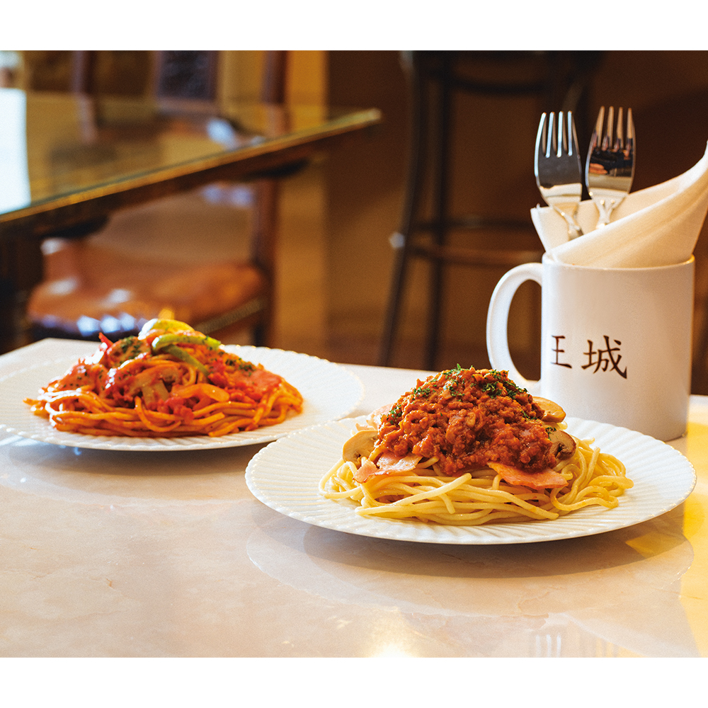 東京・上野で50年目を迎え、今も多くのファンを魅了し続ける純喫茶〈王城〉。その魅力はクラシカルで落ち着いた空間、そして昔から変わらない定番のメニュー。玉ねぎとベーコンがアクセントの、シンプルながらも味わい深いナポリタンスパゲッティは創業当時のままのレシピ。ひき肉の旨みあふれる自家製ソースがたっぷりのミートソーススパゲッティは、パスタを炒めて香ばしく仕上げることで美味しさを引き立てています。
