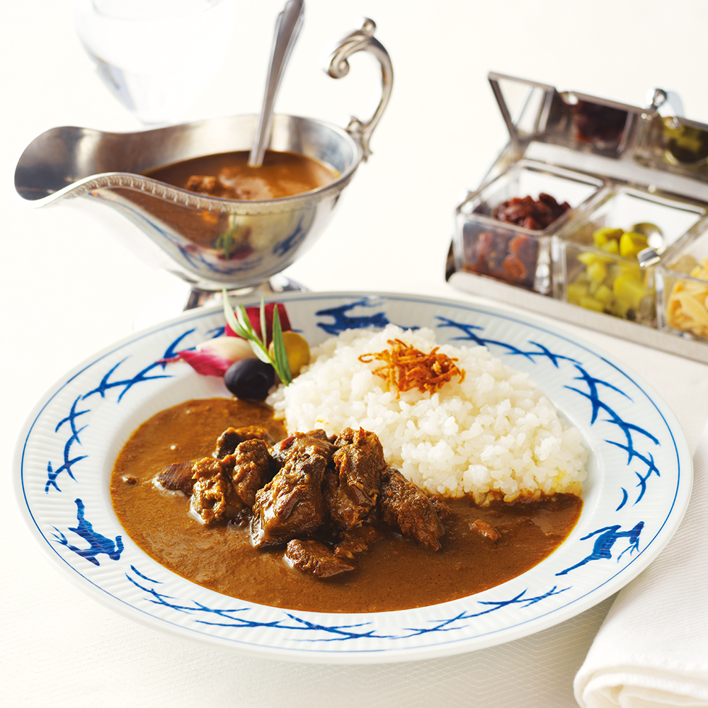 大正14年創業。銀座の食通を唸らせ続ける〈三笠会館〉伝統のチキンカレー。カレールウを使わず、野菜や果物の自然なとろみで仕上げた奥深い味わい。スパイスの爽やかな香り、キリッとした辛味が後をひく一皿。ビーフカレーとセットでお届けします。