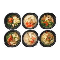 真鯛の醤油だしの小鍋270g×2、えびの味噌だしの小鍋270g×2、さわらのかす汁の小鍋285g×2 ※電子レンジ対応