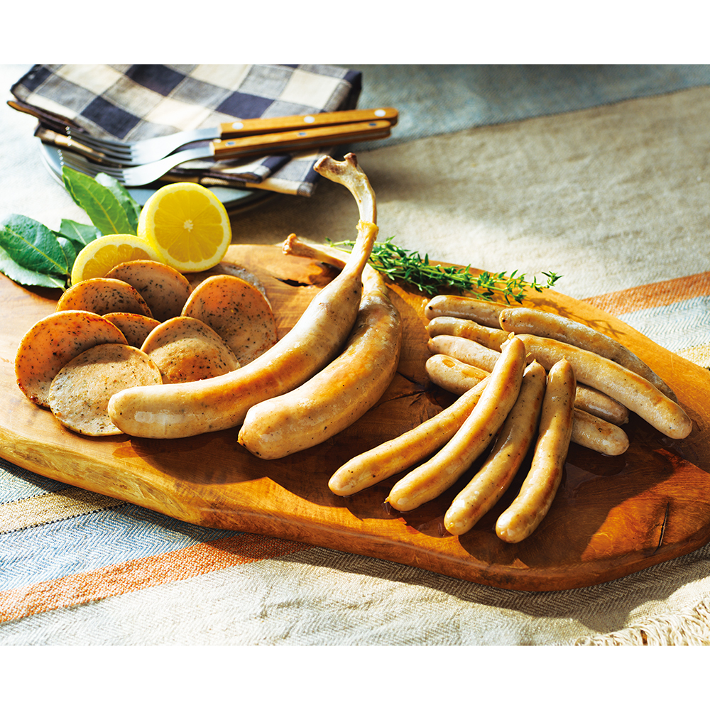 北海道知床半島、標津町の広大な草原で放牧して育てた豚から作った、フレッシュな生ソーセージを加えたセットをお届け。