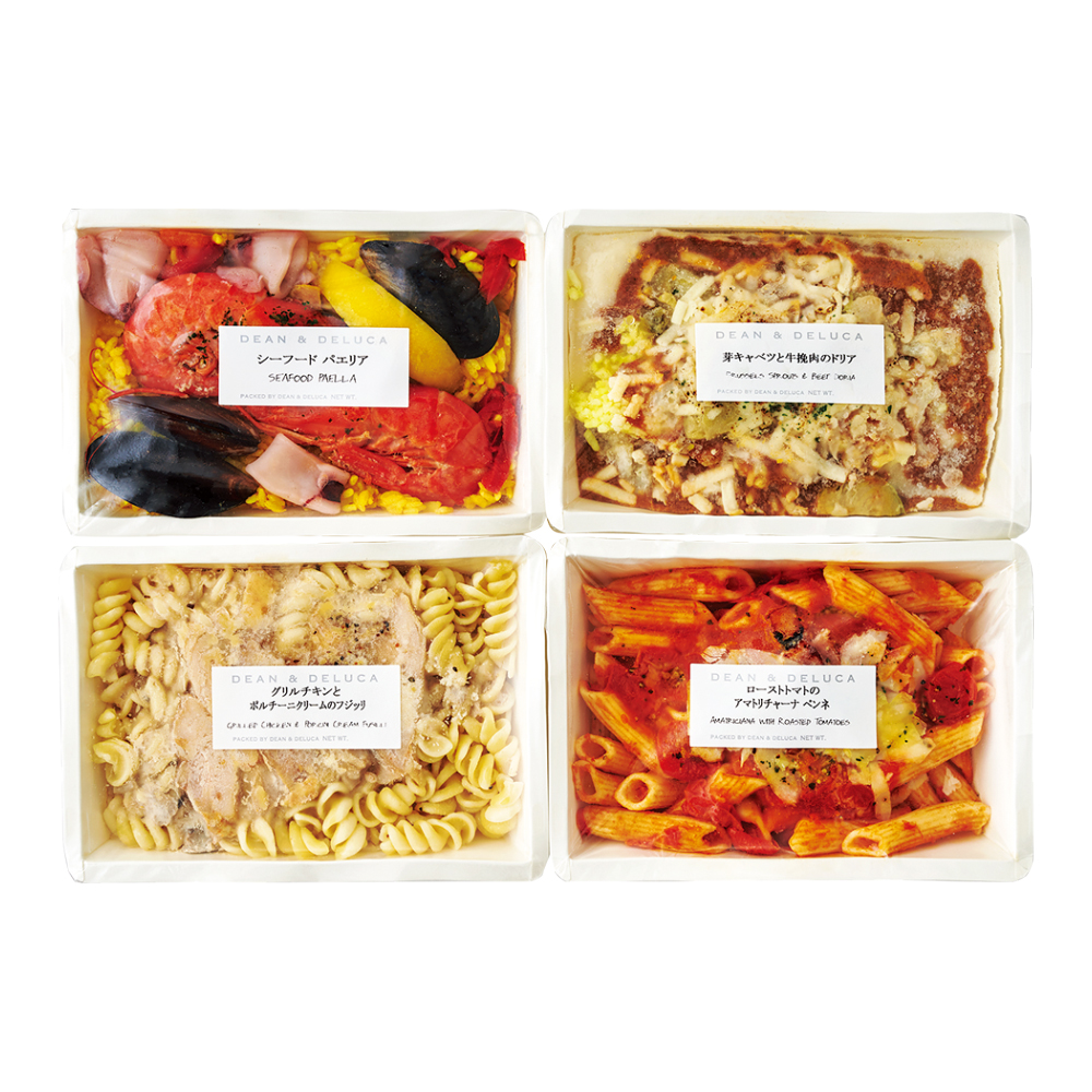 牛挽肉と芽キャベツのドリア400g、シーフードパエリア360g、グリルチキンとポルチーニクリームのフジッリ370g、ローストトマトのアマトリチャーナペンネ280g お届け時期12月22日まで(承り期間:12月15日まで)
