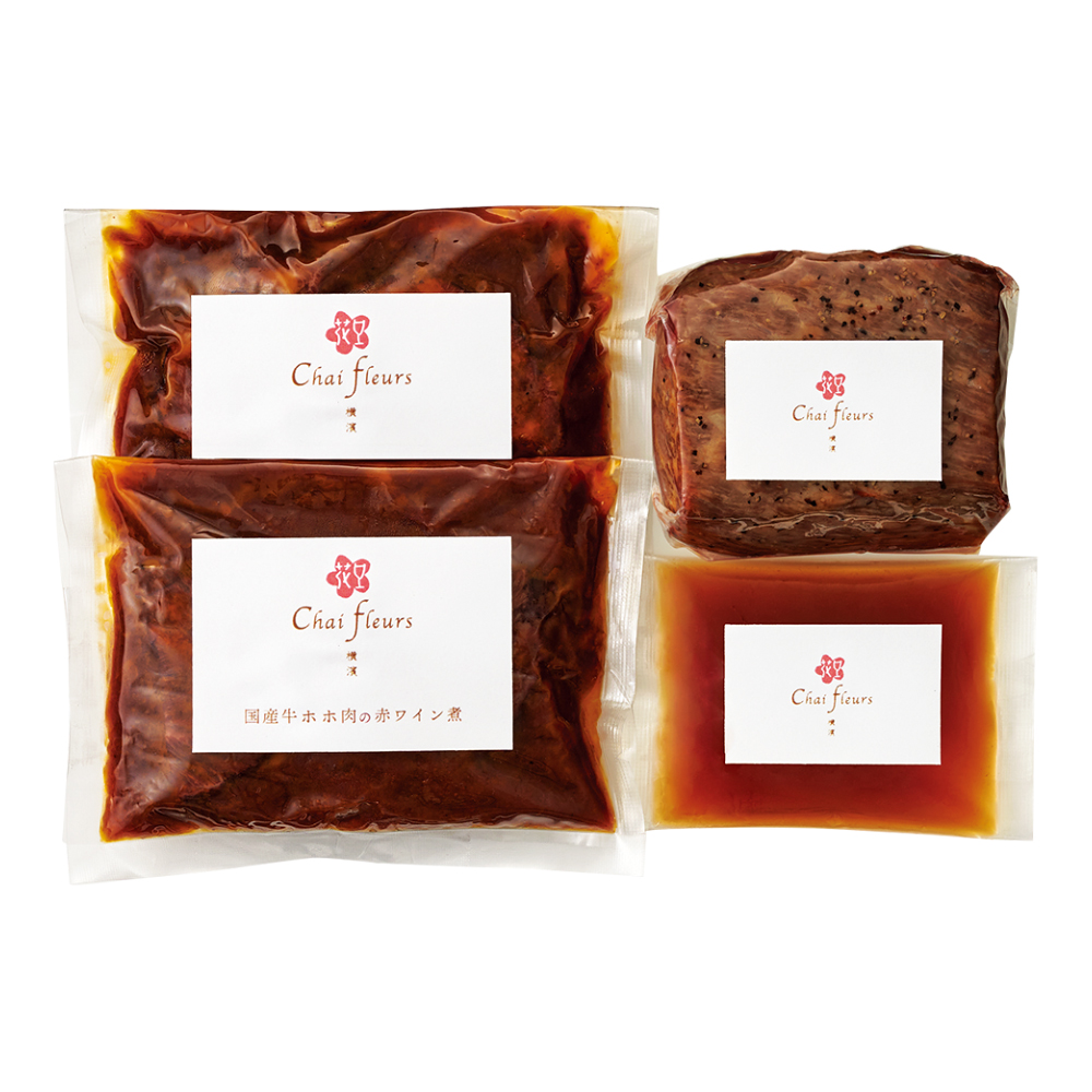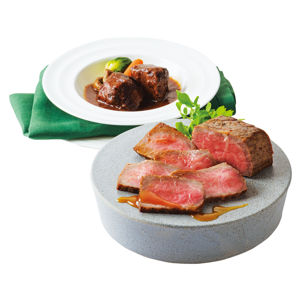 「お箸で食べられるフランス料理」を提案する〈シェ・フルール横濱〉。和フレンチソースで召しあがるローストビーフと、国産牛のホホ肉を柔らかく煮込んだ赤ワイン煮をセットにしました。
