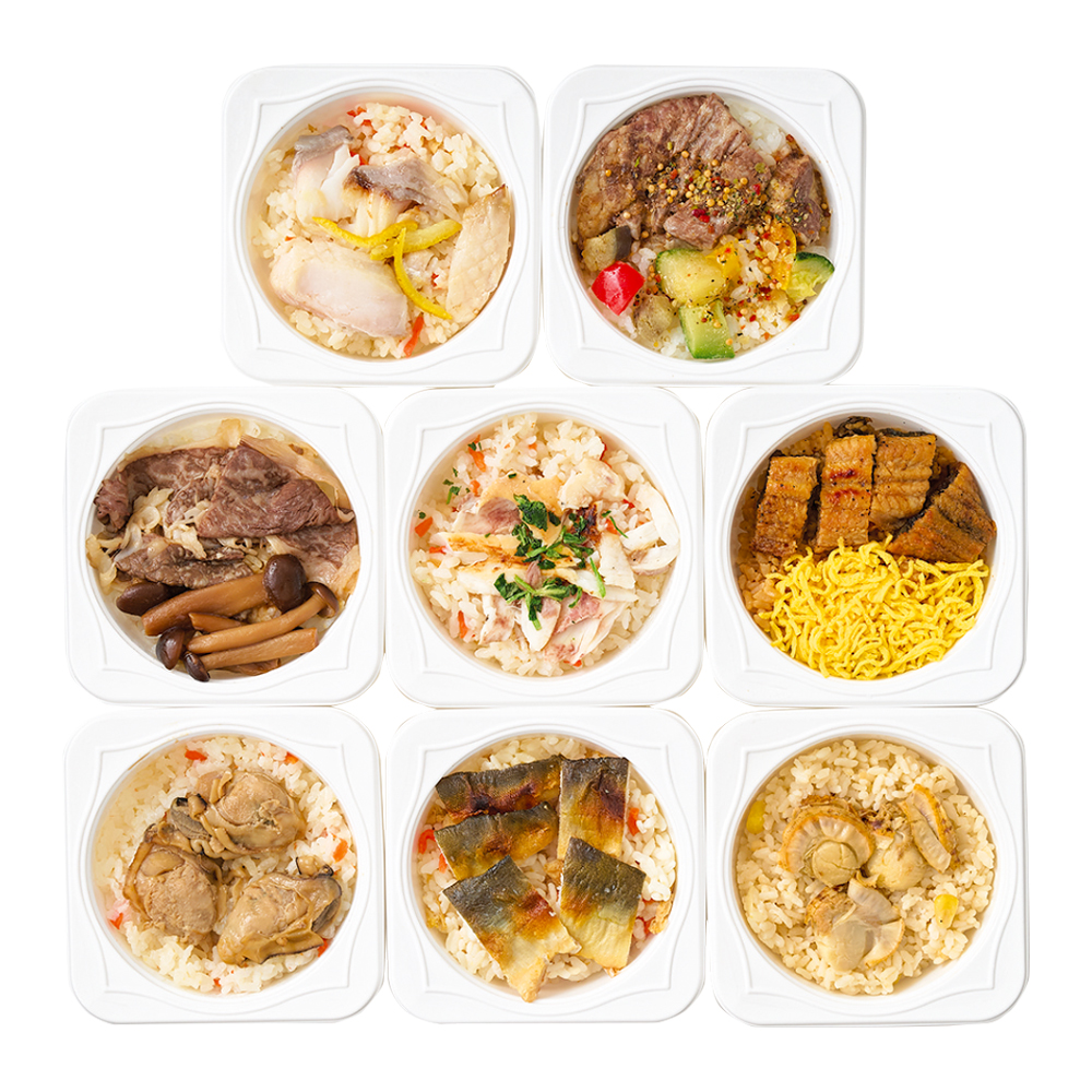 近江牛ステーキご飯125g、近江牛すき焼きご飯130g、鰻まぶしご飯・帆立バターご飯・焼き鯛ご飯・銀だら西京焼きご飯各115g、牡蠣うま煮ご飯120g、焼きあゆご飯110g 原料原産地:鰻(国産) ※電子レンジ対応