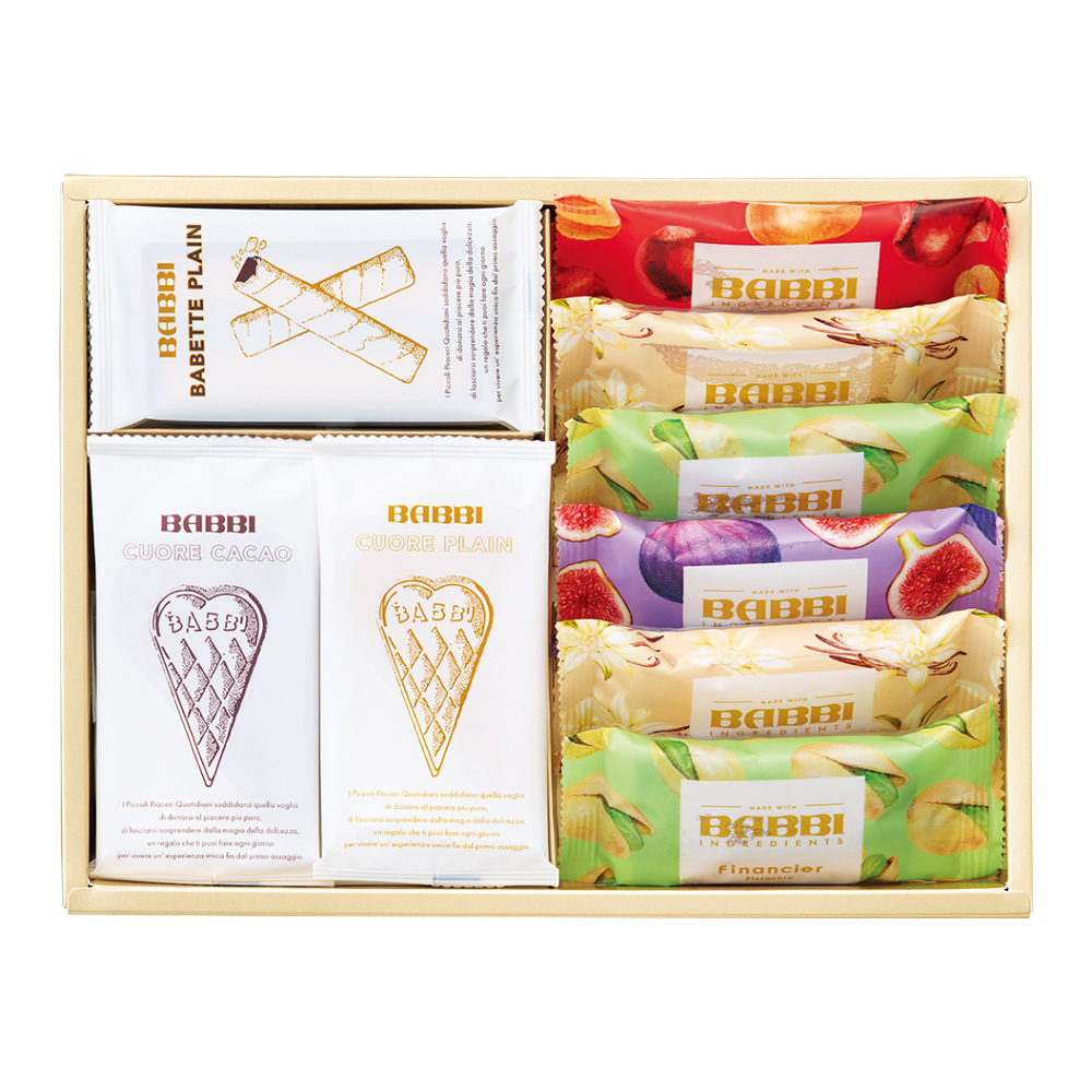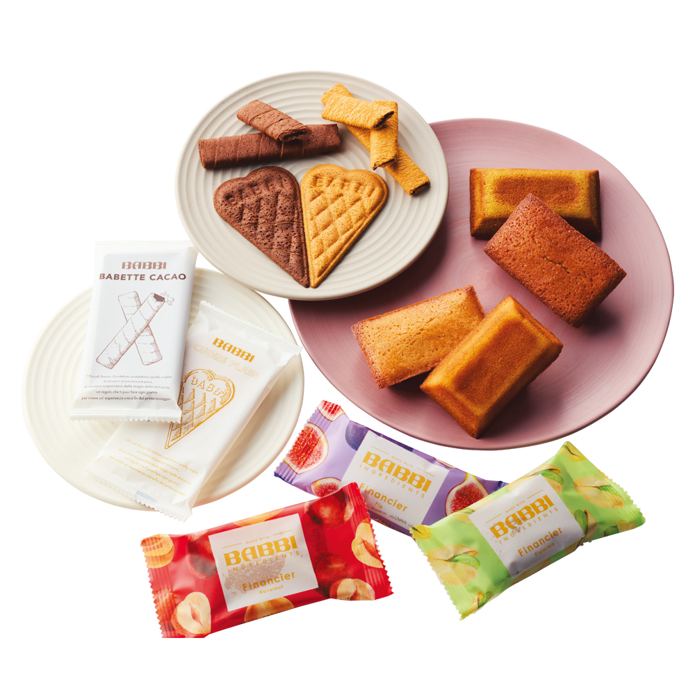 フィナンシェ(ピスタチオ・バニラ各2、ヘーゼルナッツ・リコッタイチジク)、クオーレ・クオーレカカオ各4、バベッティ・バベッティカカオ各2