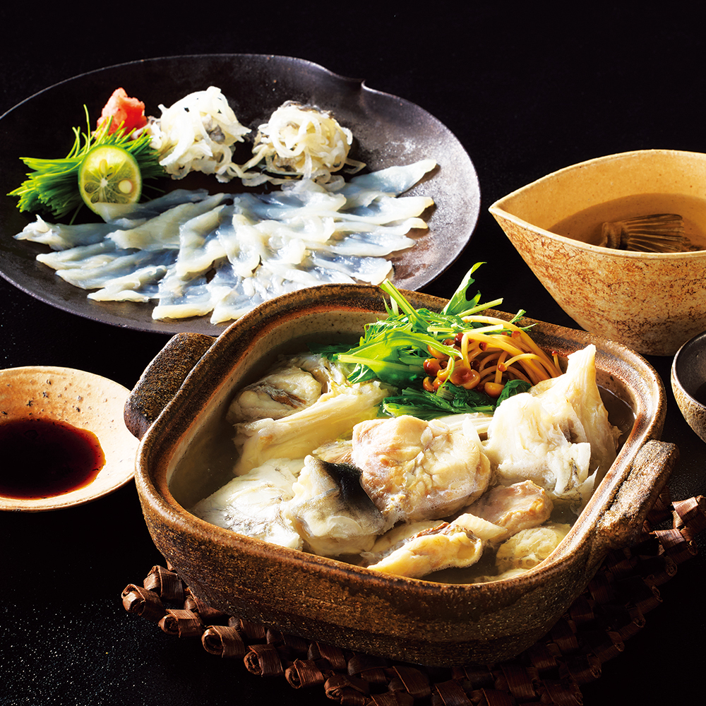 国産とらふくとまふくのふくちり鍋にはお好みの野菜を入れて。とらふくの刺身もセットに。