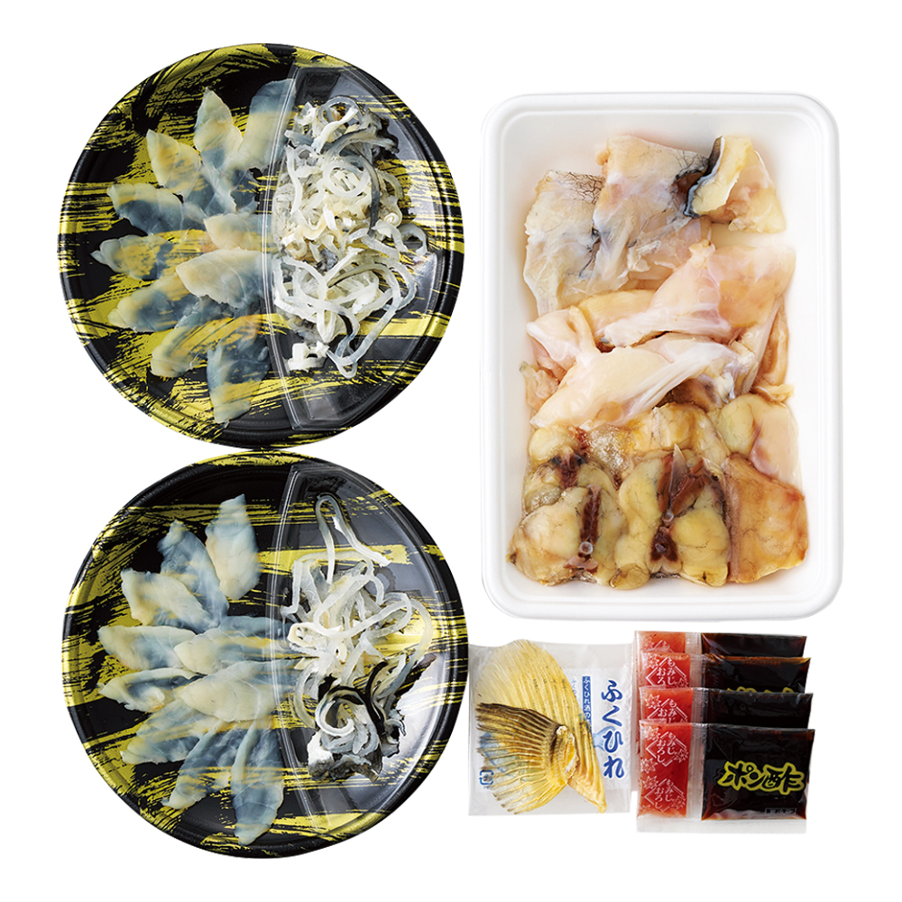 とらふく(刺身15g・皮刺身10g)25g×2、とらふくヒレ2枚、ちり(とらふくあら150g・まふく切身150g)300g、ぽん酢もみじおろし×4 ※野菜は商品に含まれておりません。原産地:とらふく(国産・養殖)、まふく(国産・天然)