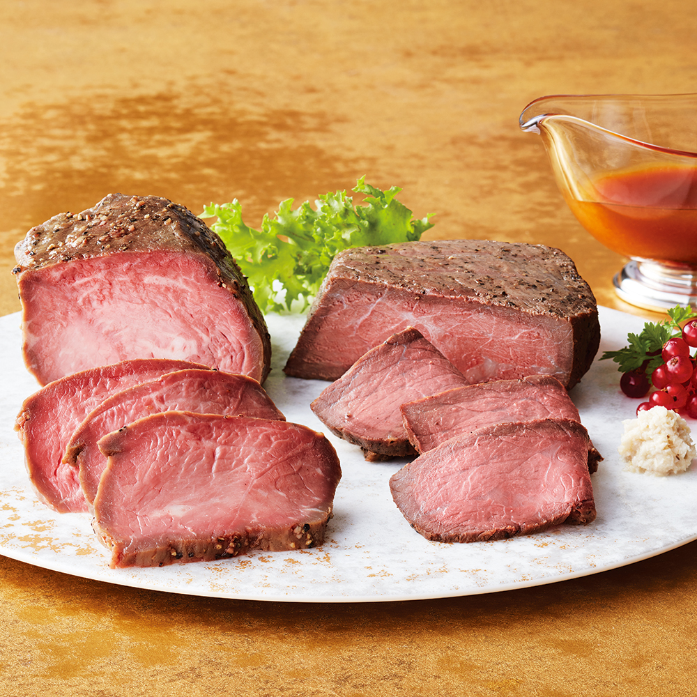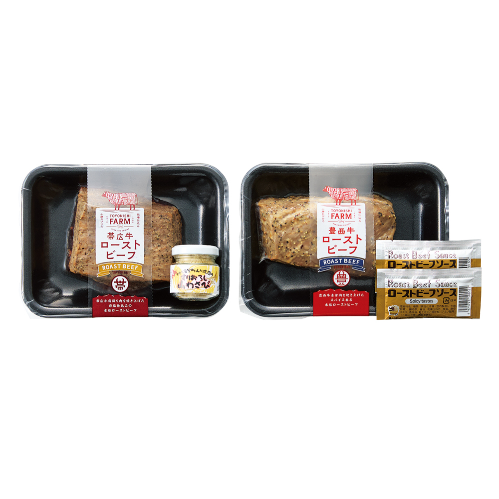 豊西牛ローストビーフ・帯広牛ローストビーフ各200g、ローストビーフソース20g×2、山わさびすりおろし30g 原料原産地:牛肉(北海道)