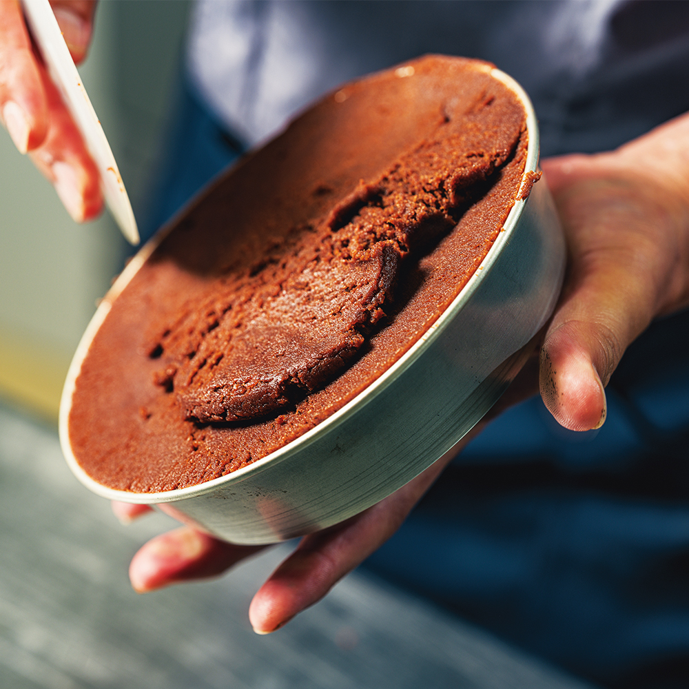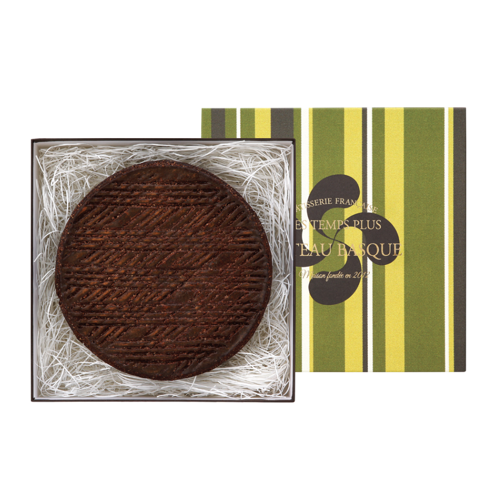 正統派の焼菓子に、カカオの風味を詰め込んで。バスク地方に伝わる素朴な焼菓子、ガトーバスク。<レタンプリュス>オーナーシェフ熊谷治久氏による、いっそう洗練された上質な味わいをお届けします。主役として選んだのは、フローラルで華やかな香りのエクアドル産カカオを使用したショコラ。繊細な香りを残すために自身の工房でカカオを焙煎し、生地とクリームに使用。ザクザクとした食感に焼きあげた生地は、北海道産バターとアーモンドに、オリジナルブレンドのココアパウダーが味の奥行きをもたらします。中には、濃厚なガナッシュとチョコレートカスタードクリーム。カカオの風味と、香り高いマール酒の余韻が広がります。シンプルな焼菓子ゆえに、素材へのこだわりとセンスが際立つ一品。贅沢なひとときのお供にご堪能ください。
