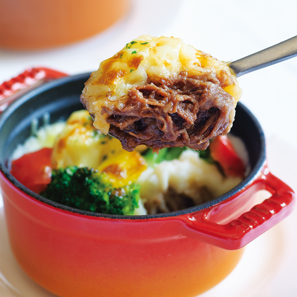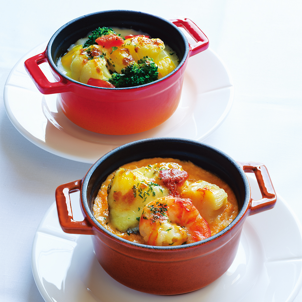 丁寧に仕立てられる、ホテルならではの味わいの層。〈志摩観光ホテル〉で受け継がれる「海の幸フランス料理」を、ご家庭でお楽しみいただける新たなギフトに。車海老のライスグラタンは、国産車海老と帆立、鮑、白身魚を盛り付け、なめらかなベシャメルソースとサフランライスを合わせました。2種の海老とトマト、香味野菜を使用したホテル伝統のアメリカンソースをかけて仕上げています。松阪牛のグラタンは、フランスの家庭料理「アッシ・パルマンティエ」をアレンジ。松阪牛をじっくりと煮込んだ赤ワイン煮に、たっぷりのバターで口溶け良く仕上げたマッシュポテトを重ね、チーズと野菜をのせてオーブンで丁寧に焼きあげました。海と山の恵みに、おもてなしの心と技が調和する2種の味わい。特別な日の食卓を、華やかに彩る一皿です。