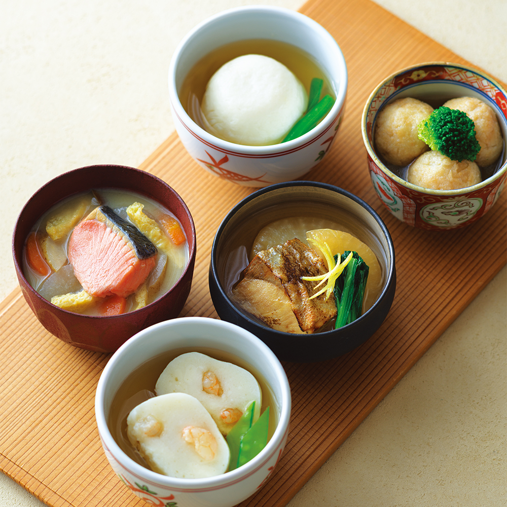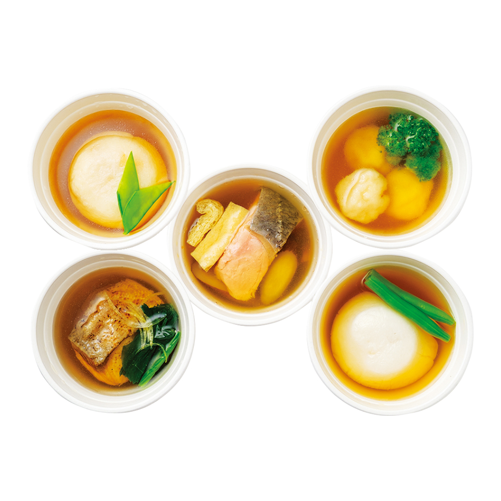 大阪・船場の本店を中心に、「うどんすき」の名店として愛される〈美々卯〉。創業100年を記念して誕生したのが「ひとわん」です。3年の歳月をかけて完成したこのメニューは日本料理の真髄である「椀物」をご家庭でも手軽に、そして多種多彩な食材を「だし」の奥深い味わいで楽しんでいただきたいという思いから開発しました。利尻昆布と本枯節をメインに使い、料理人が香り高く仕上げただしは、やさしく滋味深い味わい。ふわふわの海老真丈や帆立真丈、蓮根まんじゅう、ぶりと大根、鮭の白みその5種類の具材でお楽しみください。