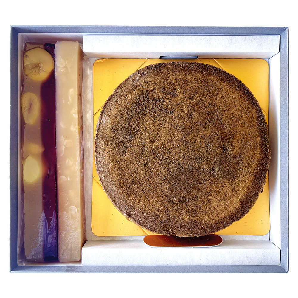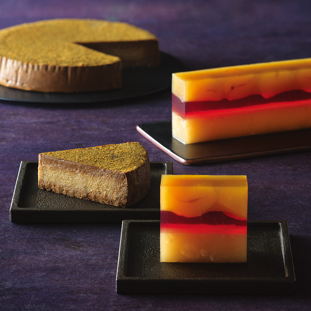 2025年、創業400年を迎えた金沢の名店が高島屋とともに、和洋の枠を超えたオリジナル菓子に取り組みました。二層になったあんテリーヌの中心には、能登大納言小豆を用いたこしあんとホワイトチョコレートを加えたガナッシュに、加賀棒茶のほろ苦さと香りを絶妙なバランスでプラス。外側はミルクチョコレートで、生チョコのような食感に。能登栗羊羹は、大粒の能登栗が入った羊羹と白雪大納言の羊羹に、奥能登ワインを使った香り高い錦玉羹の三層で、ほんのりワインが香る、モダンなデザインと味わいに仕上げています。