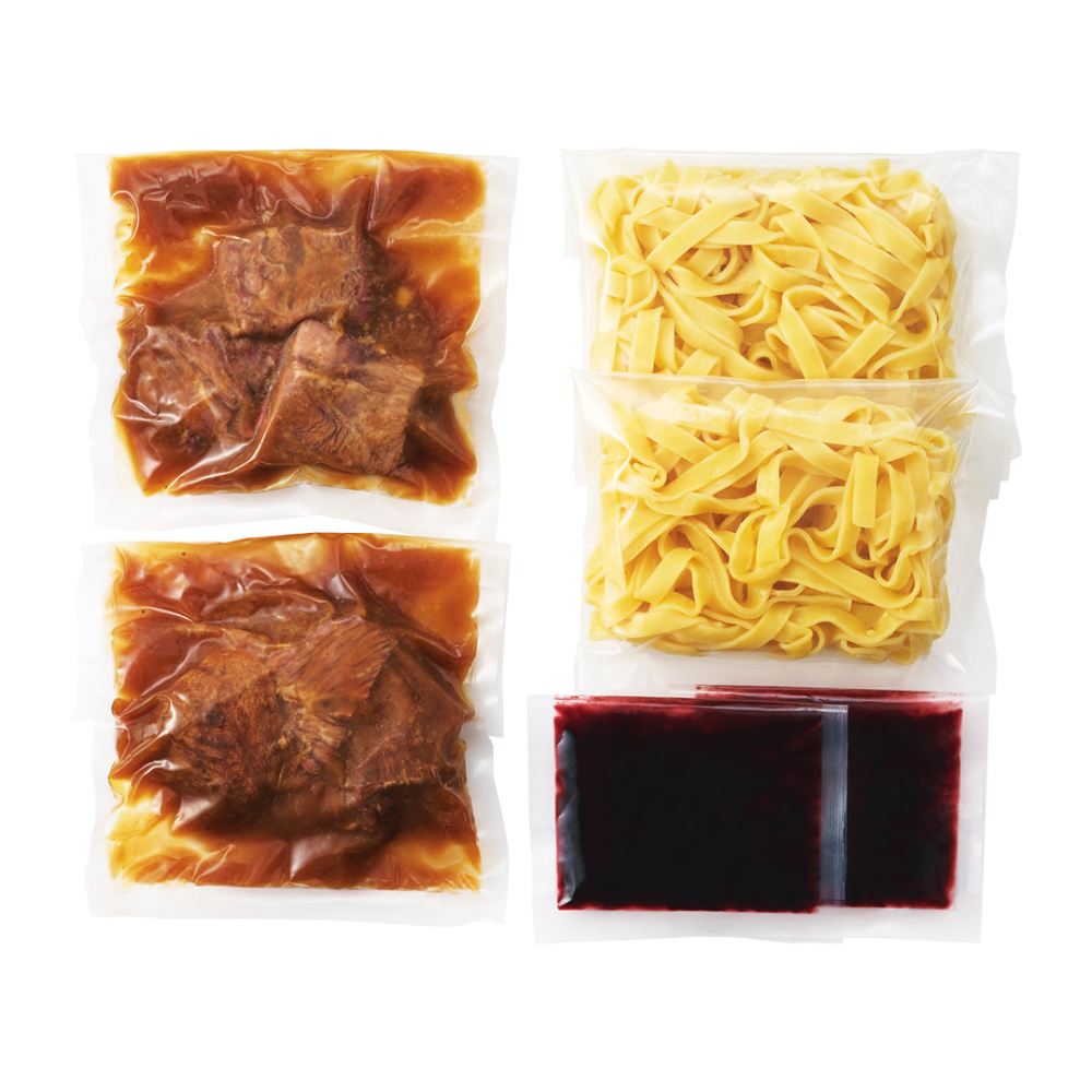 牛タンと国産牛ホホ肉の特製ビーフシチュー170g×2、赤ワインとビーツのソース15g・ヌイユ(麺)100g各2 お届け時期:11月15日から