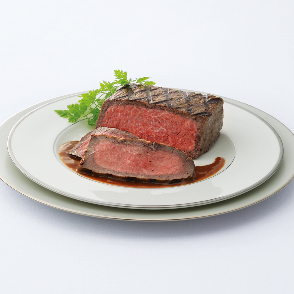 1894年創業、多くの人に愛され続ける万平ホテル。長野県産黒毛和牛のモモ肉の旨みを引き出すため、表面をグリル、中は真空調理でロゼ色に。特製ソースをかけてどうぞ。