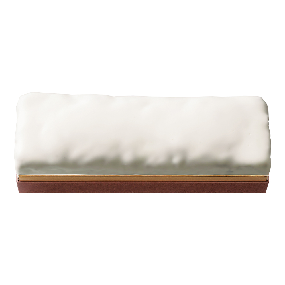 東京會舘のウエディングケーキと同じレシピのフルーツケーキ。スパイスとリキュールに漬け込んだフルーツを生地に合わせて焼きあげ、熟成。ホワイトチョコレートでコーティングしました。