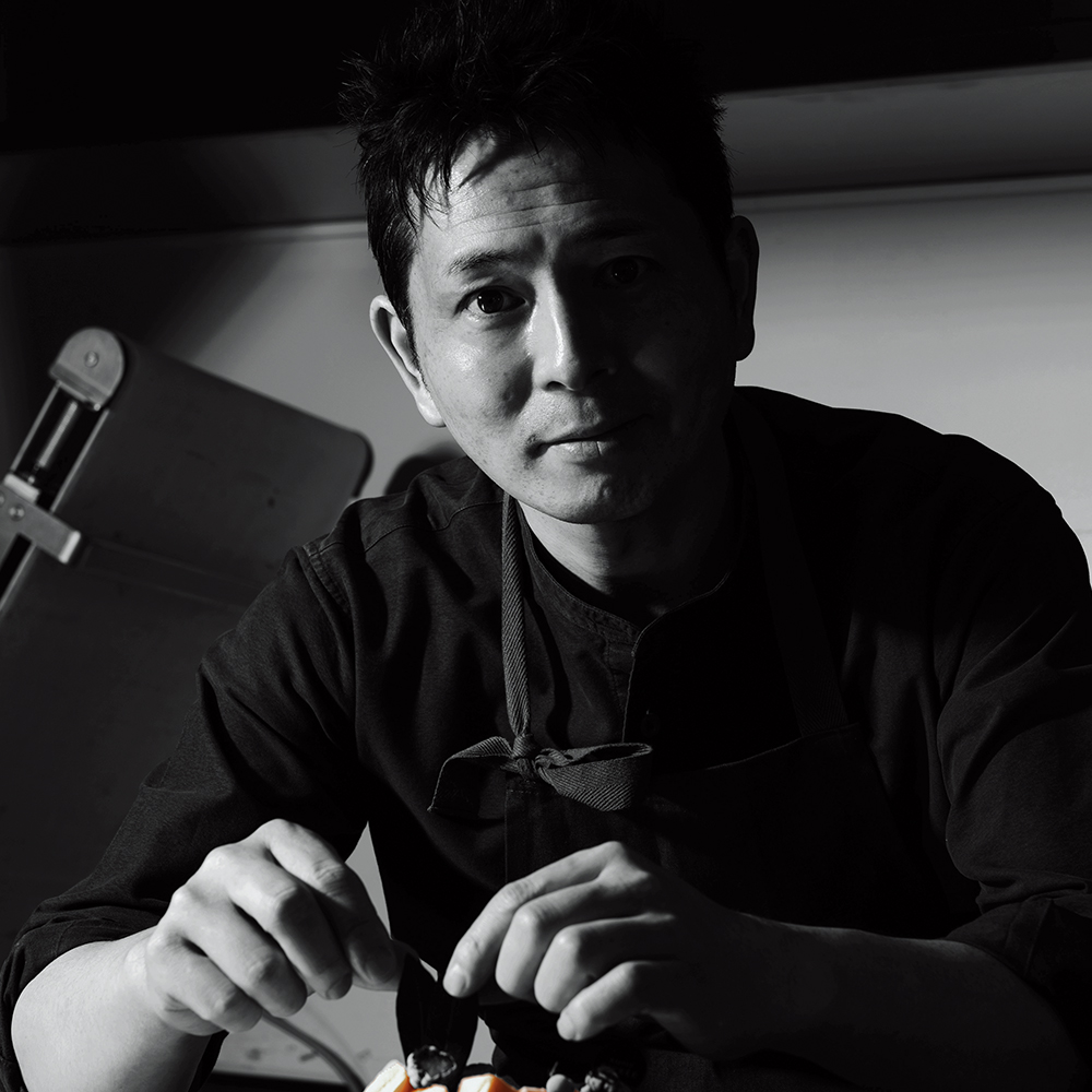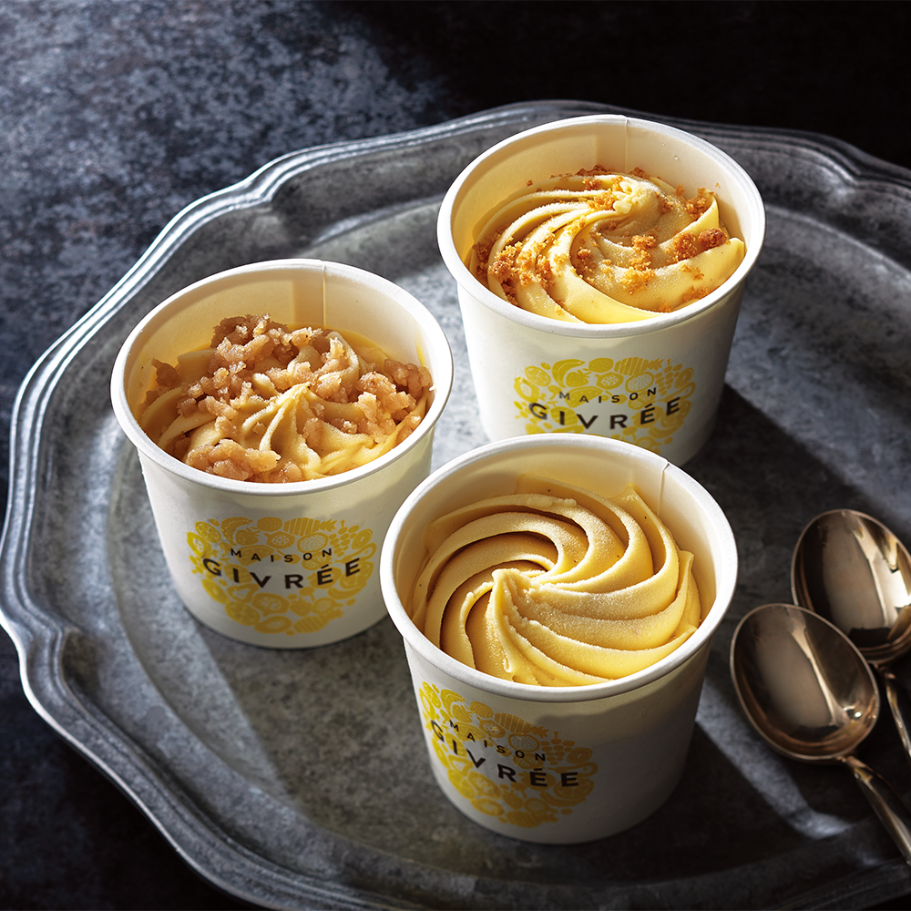 日本全国に自ら足を運んで出会った素材を使うことにこだわりを持ち、全国の食の事業者を支援する江森宏之シェフ。宮崎県産の須木栗・日の影栗と愛媛県産の栗を使ったジェラートとバニラアイスを合わせ、3種の味わいに仕立てました。