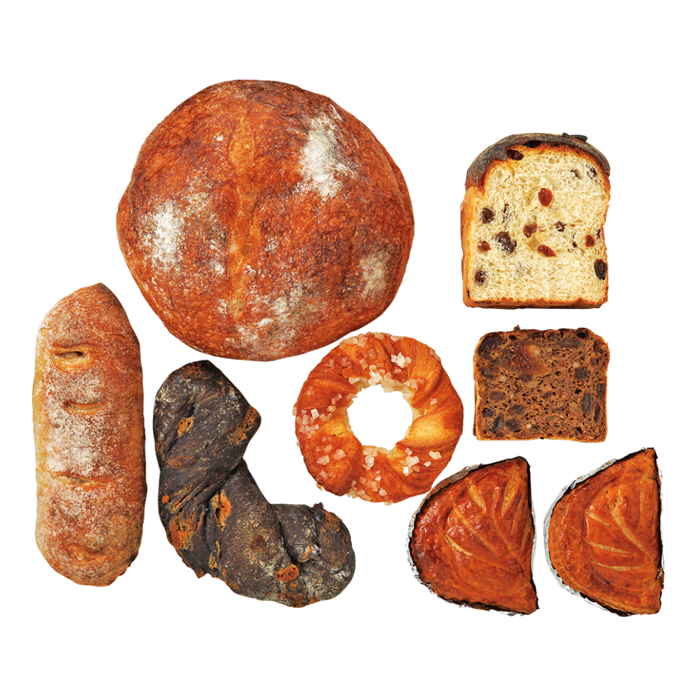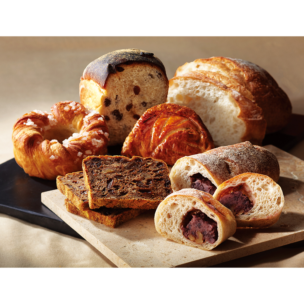 石窯レーズン食パン1/2、石窯あんパリスエッテ、ブール108、ドイツの黒い森1/4、石窯ショコラマカダミア(高島屋限定)、クロワッサンベーグル、アップルパイ2個※配送専用箱にてお届けします。