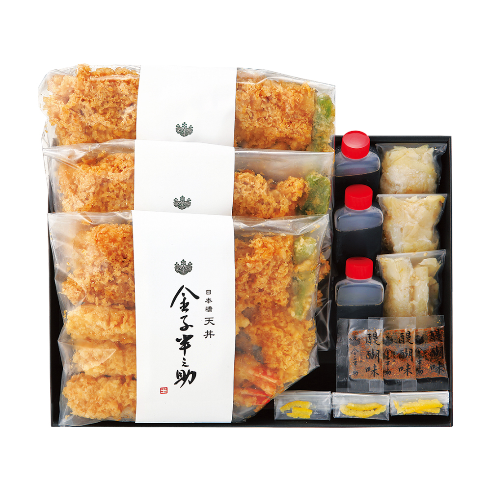 天丼ノ具(海老2尾、穴子、烏賊、しし唐)×3、秘伝のタレ・ガリごぼう・醍醐味・柚子皮各3 3人前※電子レンジ対応※写真は1人前の盛り付け例です。ご飯は含まれておりません。