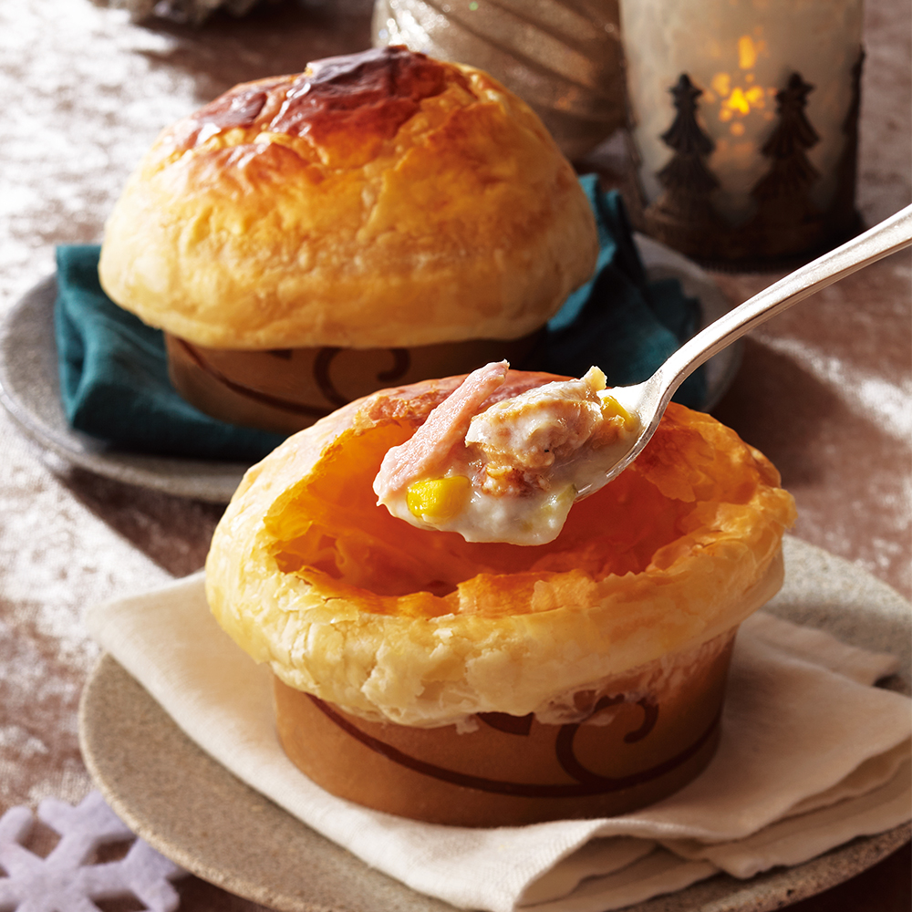 帆立と鮭、玉ねぎ、じゃがいも、牛乳、チーズなど、北海道の恵みを使ったやさしい味わいをパイ包みに。