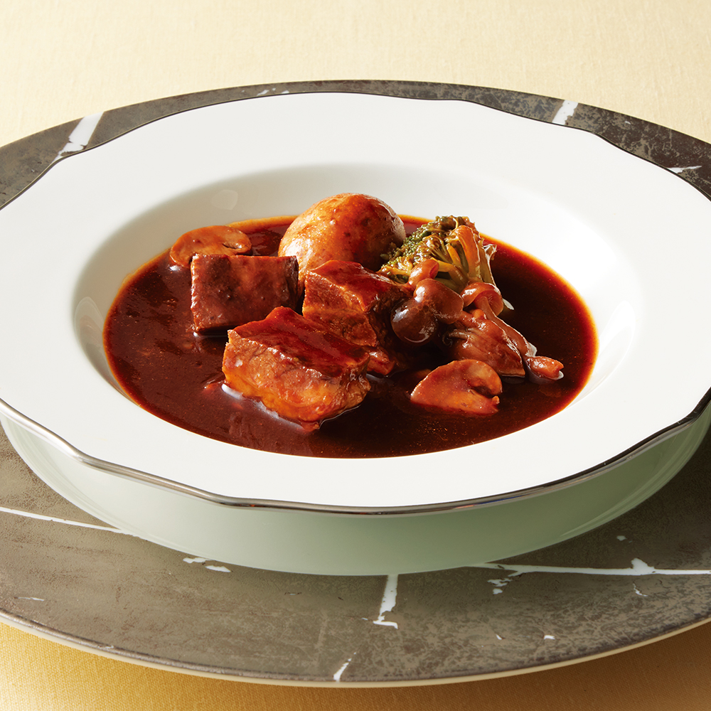 麹に漬け込んだ牛肉をデミグラスソースで煮込みました。隠し味にみそを使用して、コクをプラス。